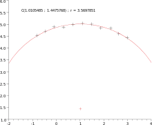 Curve fitting[1][2] is the process of constructing a curve, or mathematical function, that has the best fit to a series of data points,[3] possibly subject to constraints.[4][5] Curve fitting can involve either interpolation,[6][7] where an exact fit to the data is required, or smoothing,[8][9] in which a "smooth" function is constructed that approximately fits the data. A related topic is regression analysis,[10][11] which focuses more on questions of statistical inference such as how much uncertainty is present in a curve that is fitted to data observed with random errors. Fitted curves can be used as an aid for data visualization,[12][13] to infer values of a function where no data are available,[14] and to summarize the relationships among two or more variables.[15] Extrapolation refers to the use of a fitted curve beyond the range of the observed data,[16] and is subject to a degree of uncertainty[17] since it may reflect the method used to construct the curve as much as it reflects the observed data.