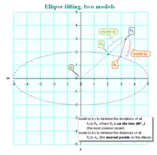 For linear-algebraic analysis of data, "fitting" usually means trying to find the curve that minimizes the vertical (y-axis) displacement of a point from the curve (e.g., ordinary least squares). However, for graphical and image applications, geometric fitting seeks to provide the best visual fit; which usually means trying to minimize the orthogonal distance to the curve (e.g., total least squares), or to otherwise include both axes of displacement of a point from the curve. Geometric fits are not popular because they usually require non-linear and/or iterative calculations, although they have the advantage of a more aesthetic and geometrically accurate result.[18][19][20]