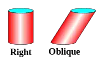 where e is the length of an element and p is the perimeter of a right section of the cylinder.[9] This produces the previous formula for lateral area when the cylinder is a right circular cylinder.