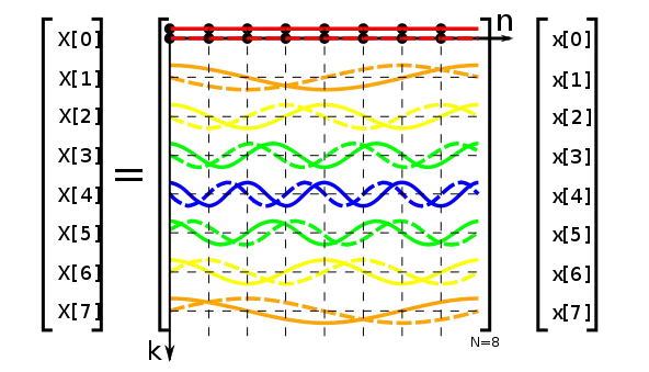 The following image depicts the DFT as a matrix multiplication, with elements of the matrix depicted by samples of complex exponentials: