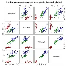 - Iris flower data set – Multivariate data set introduced by Ronald Fisher (1936).[1] Provided online by University of California-Irvine Machine Learning Repository.[6]
