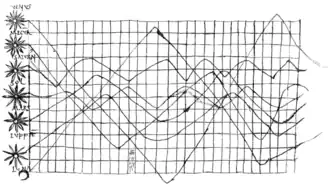 The invention of paper and parchment allowed further development of visualizations throughout history. Figure shows a graph from the 10th or possibly 11th century that is intended to be an illustration of the planetary movement, used in an appendix of a textbook in monastery schools.[45] The graph apparently was meant to represent a plot of the inclinations of the planetary orbits as a function of the time. For this purpose, the zone of the zodiac was represented on a plane with a horizontal line divided into thirty parts as the time or longitudinal axis. The vertical axis designates the width of the zodiac. The horizontal scale appears to have been chosen for each planet individually for the periods cannot be reconciled. The accompanying text refers only to the amplitudes. The curves are apparently not related in time.
