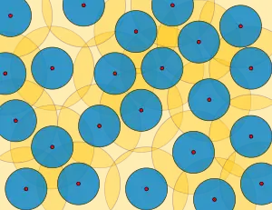 If (M, d) is a metric space, and X is a subset of M, then the packing radius, r, of X is half of the smallest distance between distinct members of X. Open balls of radius r centered at the points of X will all be disjoint from each other. The covering radius, R, of X is the smallest distance such that every point of M is within distance R of at least one point in X; that is, R is the smallest radius such that closed balls of that radius centered at the points of X have all of M as their union.