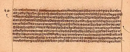 Sharada remained in parallel use in Kashmir. An early version of Devanāgarī is visible in the Kutila inscription of Bareilly dated to VS 1049 (992 CE), which demonstrates the emergence of the horizontal bar to group letters belonging to a word.[1] One of the oldest surviving Sanskrit texts from the early post-Maurya period consists of 1,413 Nāgarī pages of a commentary by Patanjali, with a composition date of about 150 BCE, the surviving copy transcribed about 14th century CE.[30]