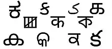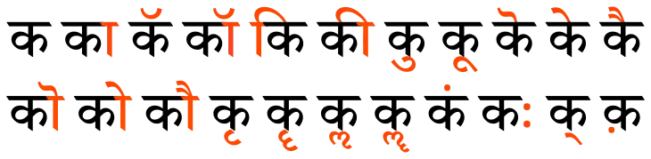 | Devanagari | क | ख | ग | घ | ङ | च | छ | ज | झ | ञ | ट | ठ | ड | ढ | ण | त | थ | द | ध | न | प | फ | ब | भ | म | य | र | ल | व | श | ष | स | ह |