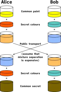 The process begins by having the two parties, Alice and Bob, publicly agree on an arbitrary starting color that does not need to be kept secret. In this example, the color is yellow. Each person also selects a secret color that they keep to themselves – in this case, red and cyan. The crucial part of the process is that Alice and Bob each mix their own secret color together with their mutually shared color, resulting in orange-tan and light-blue mixtures respectively, and then publicly exchange the two mixed colors. Finally, each of them mixes the color they received from the partner with their own private color. The result is a final color mixture (yellow-brown in this case) that is identical to their partner's final color mixture.