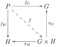 The direct product G × H can be characterized by the following universal property. Let πG: G × H → G and πH: G × H → H be the projection homomorphisms. Then for any group P and any homomorphisms ƒG: P → G and ƒH: P → H, there exists a unique homomorphism ƒ: P → G × H making the following diagram commute: