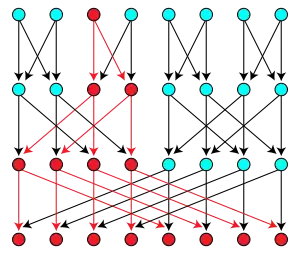 The transitive reduction of a DAG is the graph with the fewest edges that has the same reachability relation as the DAG. It has an edge u → v for every pair of vertices (u, v) in the covering relation of the reachability relation ≤ of the DAG. It is a subgraph of the DAG, formed by discarding the edges u → v for which the DAG also contains a longer directed path from u to v. Like the transitive closure, the transitive reduction is uniquely defined for DAGs. In contrast, for a directed graph that is not acyclic, there can be more than one minimal subgraph with the same reachability relation.[7] Transitive reductions are useful in visualizing the partial orders they represent, because they have fewer edges than other graphs representing the same orders and therefore lead to simpler graph drawings. A Hasse diagram of a partial order is a drawing of the transitive reduction in which the orientation of every edge is shown by placing the starting vertex of the edge in a lower position than its ending vertex.[8]