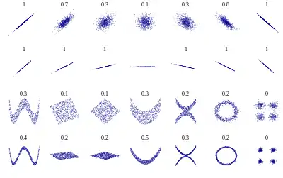 Several sets of (x, y) points, with the distance correlation coefficient of x and y for each set. Compare to the graph on correlation
