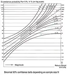 An estimate of the uncertainty in the first and second case can be obtained with the binomial probability distribution using for example the probability of exceedance Pe (i.e. the chance that the event X is larger than a reference value Xr of X) and the probability of non-exceedance Pn (i.e. the chance that the event X is smaller than or equal to the reference value Xr, this is also called cumulative probability). In this case there are only two possibilities: either there is exceedance or there is non-exceedance. This duality is the reason that the binomial distribution is applicable.