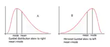 Example. The F-expression of the positively skewed Gumbel distribution is: F=exp[-exp{-(X-u)/0.78s}], where u is the mode (i.e. the value occurring most frequently) and s is the standard deviation. The Gumbel distribution can be transformed using F'=1-exp[-exp{-(x-u)/0.78s}] . This transformation yields the inverse, mirrored, or complementary Gumbel distribution that may fit a data series obeying a negatively skewed distribution.