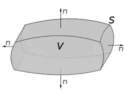 Suppose V is a subset of (in the case of n = 3, V represents a volume in three-dimensional space) which is compact and has a piecewise smooth boundary S (also indicated with ). If F is a continuously differentiable vector field defined on a neighborhood of V, then:[4][5]