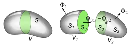 This principle applies to a volume divided into any number of parts, as shown in the diagram.[7] Since the integral over each internal partition (green surfaces) appears with opposite signs in the flux of the two adjacent volumes they cancel out, and the only contribution to the flux is the integral over the external surfaces (grey). Since the external surfaces of all the component volumes equal the original surface.