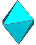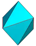 When the two pyramids are mirror images, the bipyramid is called symmetric. It is called regular if its base is a regular polygon.[1] When the base is a regular polygon and the apices are on the perpendicular line through its center (a regular right bipyramid) then all of its faces are isosceles triangles; sometimes the name bipyramid refers specifically to symmetric regular right bipyramids,[3] Examples of such bipyramids are the triangular bipyramid, octahedron (square bipyramid) and pentagonal bipyramid. In the case all of their edges are equal in length, these shapes consist of equilateral triangle faces, making them deltahedra;[4][5] the triangular bipyramid and the pentagonal bipyramid are Johnson solids, and the regular octahedron is a Platonic solid.[6]