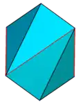 The symmetric regular right bipyramids have prismatic symmetry, the dihedral group of of order : their appearance is symmetrical by rotating around the axis of symmetry and reflecting across the mirror plane.[7] Because the appearance looks the same under such symmetries, and all of the faces are congruent, the bipyramids are isohedral.[8][9] They are the dual polyhedra of prisms and the prisms are the dual of bipyramids as well: the bipyramids vertices correspond to the faces of the prism, and the edges between pairs of vertices of one correspond to the edges between pairs of faces of the other, and vice versa;[10] the prisms shares the same symmetry as the bipyramids.[11] The regular octahedron is more symmetric still, as its base vertices and apices are indistinguishable and can be exchanged by reflections or rotations: the octahedron and its dual the cube have octahedral symmetry.[12]