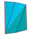 A bipyramid is a polyhedron constructed by fusing two pyramids which share the same polygonal base;[1] a pyramid is in turn constructed by connecting each vertex of its base to a single new vertex (the apex) not lying in the plane of the base, for an -gonal base forming triangular faces in addition to the base face. An -gonal bipyramid thus has faces, edges, and vertices. More generally, a right pyramid is a pyramid where the apices are on the perpendicular line through the centroid of an arbitrary polygon or the incenter of a tangential polygon, depending on the source.[lower-alpha 1] Likewise, a right bipyramid is a polyhedron constructed by attaching two symmetrical right bipyramid bases; bipyramids whose apices are not on this line are called oblique bipyramids.[2]