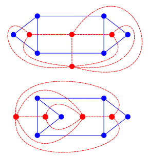 Because different embeddings may lead to different dual graphs, testing whether one graph is a dual of another (without already knowing their embeddings) is a nontrivial algorithmic problem. For biconnected graphs, it can be solved in polynomial time by using the SPQR trees of the graphs to construct a canonical form for the equivalence relation of having a shared mutual dual. For instance, the two red graphs in the illustration are equivalent according to this relation. However, for planar graphs that are not biconnected, this relation is not an equivalence relation and the problem of testing mutual duality is NP-complete.[13]