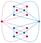 A plane graph is said to be self-dual if it is isomorphic to its dual graph. The wheel graphs provide an infinite family of self-dual graphs coming from self-dual polyhedra (the pyramids).[4][5] However, there also exist self-dual graphs that are not polyhedral, such as the one shown. Servatius & Christopher (1992) describe two operations, adhesion and explosion, that can be used to construct a self-dual graph containing a given planar graph; for instance, the self-dual graph shown can be constructed as the adhesion of a tetrahedron with its dual.[5]