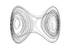 Phase portrait of a two-well Duffing oscillator (a differential equation, rather than a map) showing chaotic behavior.