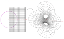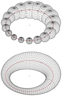 A third property which characterizes Dupin cyclides is that their curvature lines are all circles (possibly through the point at infinity). Equivalently, the curvature spheres, which are the spheres tangent to the surface with radii equal to the reciprocals of the principal curvatures at the point of tangency, are constant along the corresponding curvature lines: they are the tangent spheres containing the corresponding curvature lines as great circles. Equivalently again, both sheets of the focal surface degenerate to conics.[2] It follows that any Dupin cyclide is a channel surface (i.e., the envelope of a one-parameter family of spheres) in two different ways, and this gives another characterization.