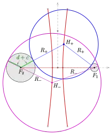 The foci of the hyperbola are . The distance of hyperbola point to the focus is and together with the sphere radius one gets . Analogously one gets . For a point on the second arm of the hyperbola one derives the equations:
