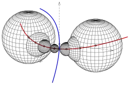 In this case the spheres touch the cyclide from outside at the second family of circles (curvature lines). To each arm of the hyperbola belongs a subfamily of circles. The spheres of one family enclose the cyclide (in diagram: purple). Spheres of the other family are touched from outside by the cyclide (blue).