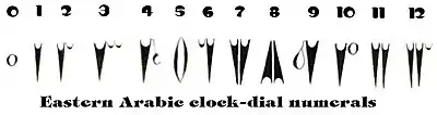| Eastern Arabic[lower-alpha 1] | ٠ | ١ | ٢ | ٣ | ٤ | ٥ | ٦ | ٧ | ٨ | ٩ | ١٠ |
