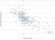 For example, consider Okun's law, which relates GDP growth to the unemployment rate. This relationship is represented in a linear regression where the change in unemployment rate () is a function of an intercept (), a given value of GDP growth multiplied by a slope coefficient and an error term, :