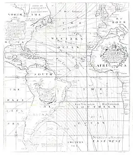 In 1698, at the behest of King William III, Halley was given command of the Paramour, a 52 feet (16 m) pink, so that he could carry out investigations in the South Atlantic into the laws governing the variation of the compass, as well as to refine the coordinates of the English colonies in the Americas.[47] On 19 August 1698, he took command of the ship and, in November 1698, sailed on what was the first purely scientific voyage by an English naval vessel. Unfortunately problems of insubordination arose over questions of Halley's competence to command a vessel. Halley returned the ship to England to proceed against officers in July 1699. The result was a mild rebuke for his men, and dissatisfaction for Halley, who felt the court had been too lenient.[48] Halley thereafter received a temporary commission as a captain in the Royal Navy, recommissioned the Paramour on 24 August 1699 and sailed again in September 1699 to make extensive observations on the conditions of terrestrial magnetism. This task he accomplished in a second Atlantic voyage which lasted until 6 September 1700, and extended from 52 degrees north to 52 degrees south. The results were published in General Chart of the Variation of the Compass (1701).[9] This was the first such chart to be published and the first on which isogonic, or Halleyan, lines appeared.[12][49] The use of such lines inspired later ideas such as those of isotherms by Alexander von Humboldt in his maps.[50] In 1701, Halley made a third and final voyage on the Paramour to study the tides of the English Channel.[51] In 1702, he was dispatched by Queen Anne on diplomatic missions to other European leaders.[51]