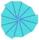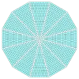 Sections of stacked triangles and squares can be combined into radial forms. This mixes two vertex configurations, 3.3.3.4.4 and 3.3.4.3.4 on the transitions. Twelve copies are needed to fill the plane with different center arrangements. The duals will mix in cairo pentagonal tiling pentagons.[3]