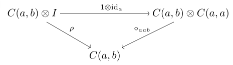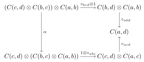 - an arrow °abc : C(b, c) ⊗ C(a, b) → C(a, c) in M designating a composition for each triple of objects a, b, c in C, used to define the composition of and in C as together with three commuting diagrams, discussed below.