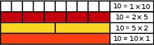 Demonstration, with Cuisenaire rods, that the composite number 10 is equidigital: 10 has two digits, and 2 × 5 has two digits (1 is excluded)