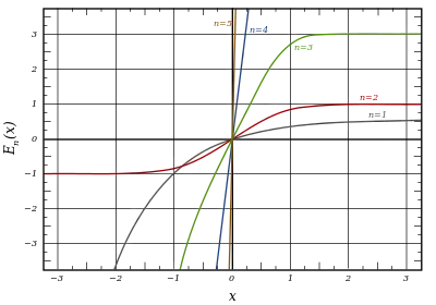 After division by n!, all the En for odd n look similar (but not identical) to each other. Similarly, the En for even n look similar (but not identical) to each other after a simple division by n!. All generalised error functions for n > 0 look similar on the positive x side of the graph.