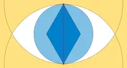 For any edge of any Euclidean minimum spanning tree, the lens (or vesica piscis) formed by intersecting the two circles with as their radii cannot have any other given vertex in its interior. Put another way, if any tree has an edge whose lens contains a third point , then it is not of minimum length. For, by the geometry of the two circles, would be closer to both and than they are to each other. If edge were removed from the tree, would remain connected to one of and , but not the other. Replacing the removed edge by or (whichever of these two edges reconnects to the vertex from which it was disconnected) would produce a shorter tree.[12]