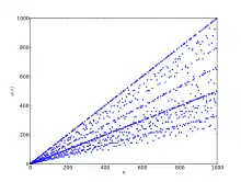 In the graph at right the top line y = n − 1 is an upper bound valid for all n other than one, and attained if and only if n is a prime number. A simple lower bound is , which is rather loose: in fact, the lower limit of the graph is proportional to n/log log n.[20]