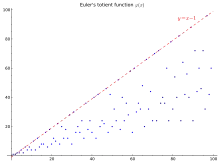 In number theory, Euler's totient function counts the positive integers up to a given integer n that are relatively prime to n. It is written using the Greek letter phi as or , and may also be called Euler's phi function. In other words, it is the number of integers k in the range 1 ≤ k ≤ n for which the greatest common divisor gcd(n, k) is equal to 1.[2][3] The integers k of this form are sometimes referred to as totatives of n.