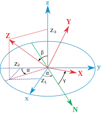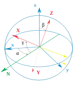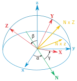 - The XYZ system rotates again, but this time about the x axis by β. The Z axis is now at angle β with respect to the z axis.
