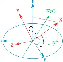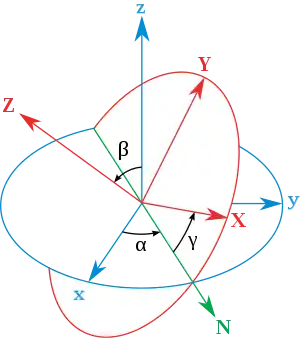 - (or ) is the signed angle between the N axis and the X axis (x-convention).