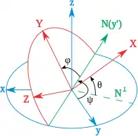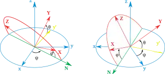 For the above-listed sequence of rotations, the line of nodes N can be simply defined as the orientation of X after the first elemental rotation. Hence, N can be simply denoted x′. Moreover, since the third elemental rotation occurs about Z, it does not change the orientation of Z. Hence Z coincides with z″. This allows us to simplify the definition of the Euler angles as follows: