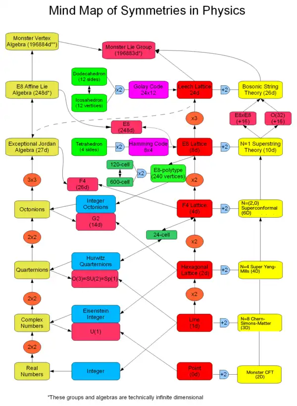 - The exceptional Lie groups can be seen as symmetries of the octonions and structures derived from the octonions;[19] further, the E8 algebra is related to the E8 lattice, as the notation implies (the lattice is generated by the root system of the algebra).