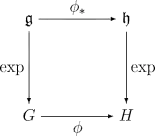 Let be a Lie group homomorphism and let be its derivative at the identity. Then the following diagram commutes:[8]