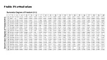 The result of the F test can be determined by comparing calculated F value and critical F value with specific significance level (e.g. 5%). The F table serves as a reference guide containing critical F values for the distribution of the F-statistic under the assumption of a true null hypothesis. It is designed to help determine the threshold beyond which the F statistic is expected to exceed a controlled percentage of the time (e.g., 5%) when the null hypothesis is accurate. To locate the critical F value in the F table, one needs to utilize the respective degrees of freedom. This involves identifying the appropriate row and column in the F table that corresponds to the significance level being tested (e.g., 5%).[6]