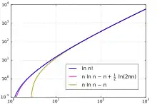 The binary logarithm of the factorial, used to analyze comparison sorting, can be very accurately estimated using Stirling's approximation. In the formula below, the term invokes big O notation.[45]