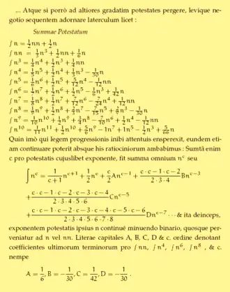 In 1713, Jacob Bernoulli published under the title Summae Potestatum an expression of the sum of the p powers of the n first integers as a (p + 1)th-degree polynomial function of n, with coefficients involving numbers Bj, now called Bernoulli numbers: