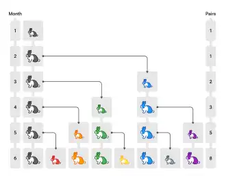- At the end of the fourth month, the original pair has produced yet another new pair, and the pair born two months ago also produces their first pair, making 5 pairs.