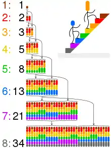 The sequence is also considered using the symbolic method.[34] More precisely, this sequence corresponds to a specifiable combinatorial class. The specification of this sequence is . Indeed, as stated above, the -th Fibonacci number equals the number of combinatorial compositions (ordered partitions) of using terms 1 and 2.