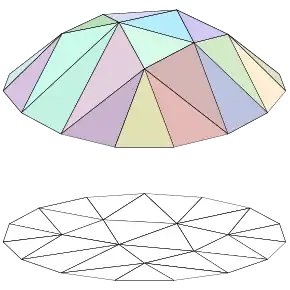 We need to be a set of functions of . In the figure on the right, we have illustrated a triangulation of a 15-sided polygonal region in the plane (below), and a piecewise linear function (above, in color) of this polygon which is linear on each triangle of the triangulation; the space would consist of functions that are linear on each triangle of the chosen triangulation.