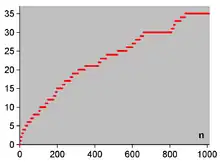 ![]() Plot showing the number of twin primes less than a given n. The first Hardy–Littlewood conjecture predicts there are infinitely many of these. | |
