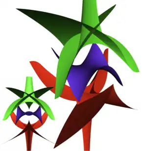 As the principal curvatures are the eigenvalues of the second fundamental form, there are two at each point, and these give rise to two points of the focal surface on each normal direction to the surface. Away from umbilical points, these two points of the focal surface are distinct; at umbilical points the two sheets come together. When the surface has a ridge the focal surface has a cuspidal edge, three such edges pass through an elliptical umbilic and only one through a hyperbolic umbilic.[3] At points where the Gaussian curvature is zero, one sheet of the focal surface will have a point at infinity corresponding to the zero principal curvature.