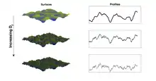 The concept of fractality is applied increasingly in the field of surface science, providing a bridge between surface characteristics and functional properties.[26] Numerous surface descriptors are used to interpret the structure of nominally flat surfaces, which often exhibit self-affine features across multiple length-scales. Mean surface roughness, usually denoted RA, is the most commonly applied surface descriptor, however numerous other descriptors including mean slope, root mean square roughness (RRMS) and others are regularly applied. It is found however that many physical surface phenomena cannot readily be interpreted with reference to such descriptors, thus fractal dimension is increasingly applied to establish correlations between surface structure in terms of scaling behavior and performance.[27] The fractal dimensions of surfaces have been employed to explain and better understand phenomena in areas of contact mechanics,[28] frictional behavior,[29] electrical contact resistance[30] and transparent conducting oxides.[31]